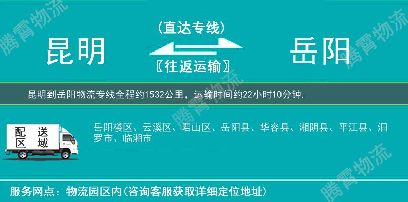 歡迎來電咨詢昆明到岳陽物流專線相關(guān)信息,天天發(fā)貨,全程3-7天可將您的貨物送至岳陽全市:汨羅市、平江縣、岳陽縣、岳陽樓區(qū)、臨湘市、君山區(qū)、華容縣、云溪區(qū)、湘陰縣、。